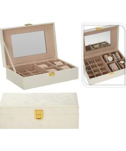Μπιζουτιέρα ξύλινη με καθρέφτη. Είναι υπενδεδυμένη με μπεζ βελούδινο υλικό και διαθέτει 12 θέσεις για δακτυλίδια, κολιέ ή σκουλαρίκια και 4 θέσεις για ρολόγια ή βραχιόλια. Διαθέτει μεταλλικό κλείστρο σε χρυσό χρώμα ώστε να ασφαλίζει. Ιδανική για την τακτοποίηση και οργάνωση των κοσμημάτων και των αξεσουάρ σας.