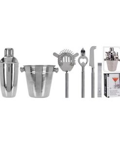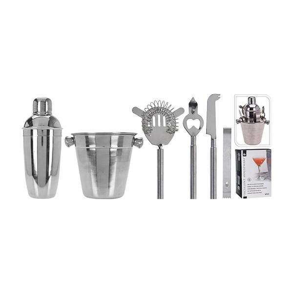 Σετ μπαρ 6 τεμαχίων από ανοξείδωτο ατσάλι 201. Κάθε σετ περιλαμβάνει κουβά, σέικερ, σουρωτήρι, ανοιχτήρι, μαχαίρι και λαβίδα.