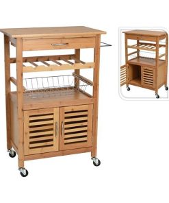 Τρόλεϊ κουζίνας από μπαμπού το οποίο διαθέτει ένα ντουλάπι με 2 πορτάκια, μια κρεμάστρα για πετσέτες με γυαλιστερό φινίρισμα, ένα συρτάρι, ένα μεταλλικό ματ γκρι καλάθι και 5 θήκες για μπουκάλια. Περιλαμβάνει επίσης 4 ροδάκια, τα 2 με στοπ ώστε να μπορείτε να το σύρετε ή να το μετακινείτε όπου θέλετε.