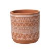 Κασπώ-γλάστρα, κεραμική σε χρώμα terracotta με όμορφη γεωμετρική ανάγλυφη διακόσμηση σε λευκό χρώμα. Διαθέτει προστατευτικά πέλματα στο κάτω μέρος για να μην χαράσσει τις επιφάνειες που τοποθετείται.