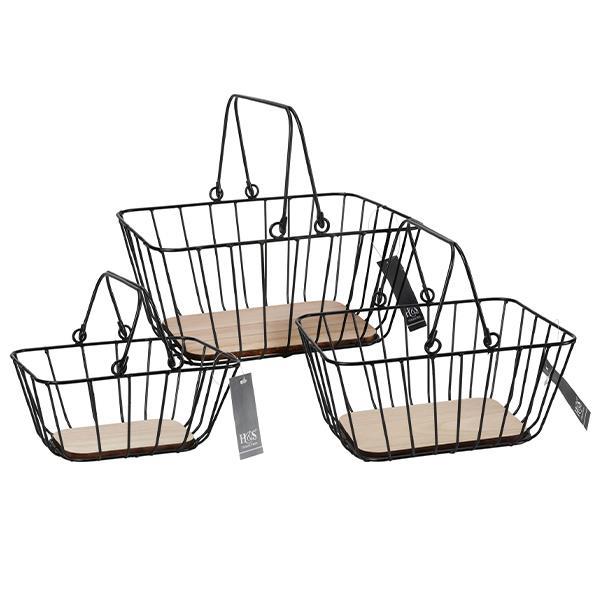 Σετ με 3 μεταλλικά συρμάτινα καλάθια ηλεκτροστατικά βαμμένα σε μαύρο χρώμα. Διαθέτουν δύο λαβές και πάτο από MDF. Αυτό το καλάθι αποθήκευσης θα είναι μια πρακτική βοήθεια στο σπίτι, όπου θα σας εξοικονομήσει χώρο. Χρησιμοποιήστε τα για την αποθήκευση μικρών αντικειμένων σε ράφια ή στην ντουλάπα. Κατάλληλα επίσης και για διακόσμηση.