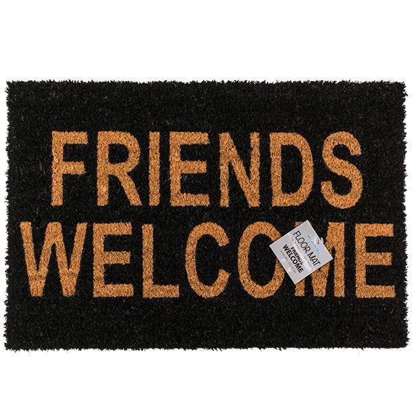 Ταπέτο εισόδου μαύρο με καφέ γράμματα “Friends Welcome”.