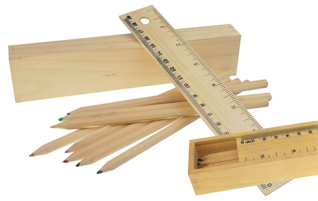 Ξυλομπογιές και χάρακας σε ξύλινη κασετίνα.