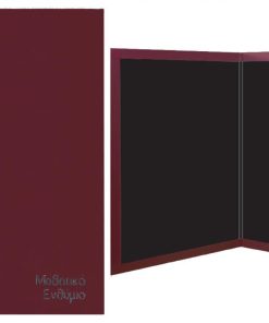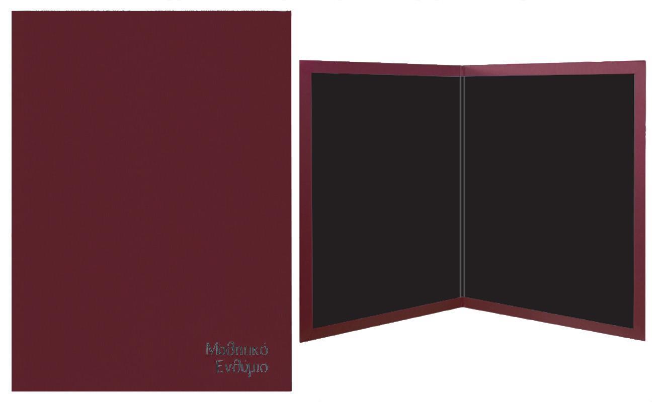 Σχολικό ενθύμιο δίπτυχο μπορντώ με δερματίνη από σκληρό χαρτόνι 2χιλ. Μαύρο χαρτί εσωτερικά για να κολλάτε τις φωτογραφίες σας. Δυνατότητα ασημοτυπίας στο εξώφυλλο με το όνομα του σχολείου και το σχολικό έτος. Διαστάσεις: 23,5×32εκ.