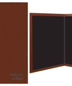 Σχολικό ενθύμιο δίπτυχο καφέ με δερματίνη από σκληρό χαρτόνι 2χιλ. Μαύρο χαρτί εσωτερικά για να κολλάτε τις φωτογραφίες σας. Δυνατότητα ασημοτυπίας στο εξώφυλλο με το όνομα του σχολείου και το σχολικό έτος. Διαστάσεις: 23,5×32εκ.