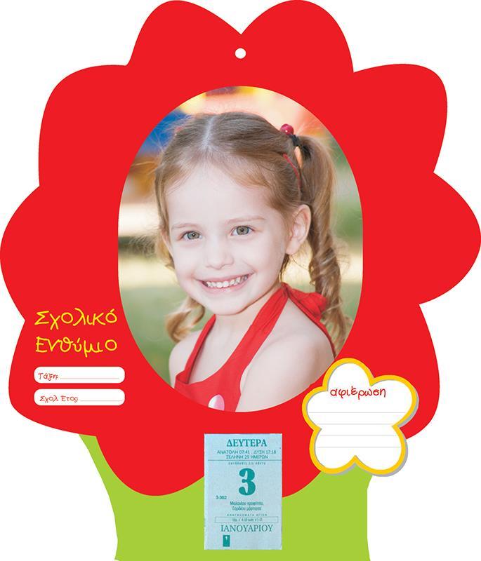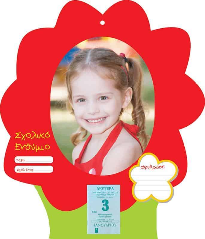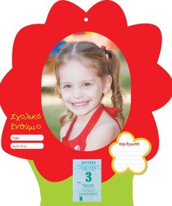 Σχολικό ενθύμιο με κοπτικό “Λουλούδι” κίτρινο – ημερολόγιο. Η φωτογραφία κολλιέται στην πίσω μεριά του ενθυμίου, με χώρο για χειρόγραφη αφιέρωση του παιδιού. Ο ημερήσιος ημεροδείκτης μπορεί να είναι θρησκευτικός ή ποιημάτων. Διαστάσεις: 24×28εκ. Για φωτογραφία 13×18εκ.