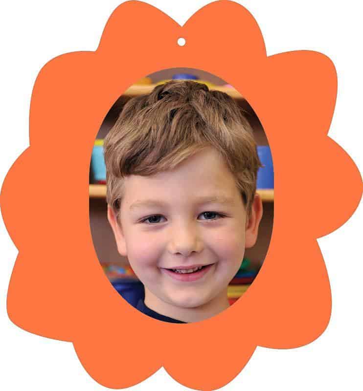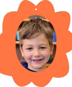 Σχολικό ενθύμιο με κοπτικό “Λουλούδι” πορτοκαλί. Εξωτερικά χρωματιστό χαρτόνι 220γρ. κολλημένο πάνω σε χοντρό χαρτόνι. Διαστάσεις: 23×25εκ. Για φωτογραφία 13×18εκ.
