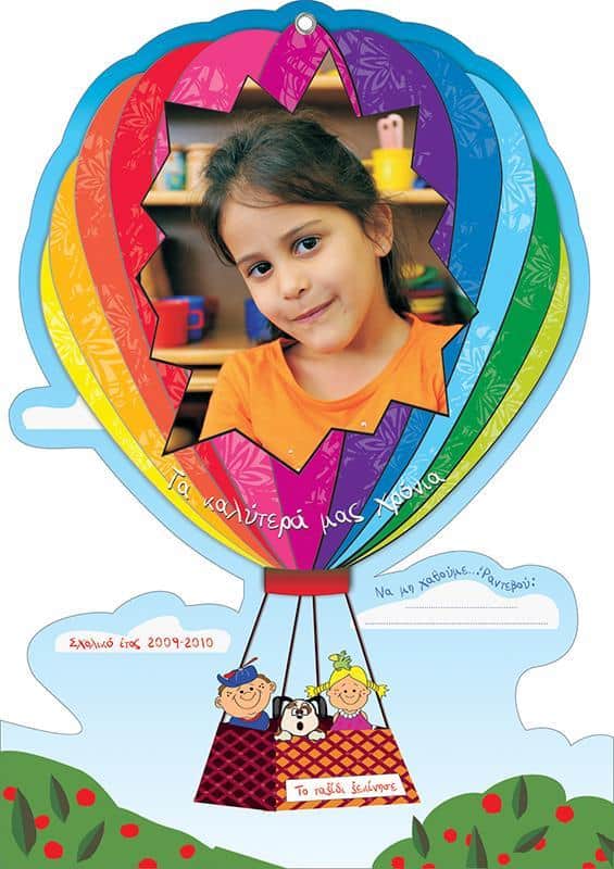 Σχολικό ενθύμιο “Αερόστατο” με κοπτικό. Από σκληρό χαρτόνι 2.5 χιλιοστών. Τυπωμένο 4χρωμία 2 όψεις. Με μεταλλικό τρουκ για να κρέμεται στον τοίχο σαν κάδρο. Ψηφιακή εκτύπωση των φωτογραφιών του μαθητή και της τάξης (σε σχήμα περίπου 13×18εκ.) και αναγραφή του ονόματος του σχολείου, της τάξης και του σχολικού έτους. Διαστάσεις: 43×30εκ.