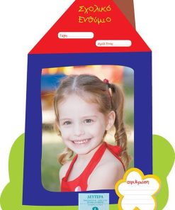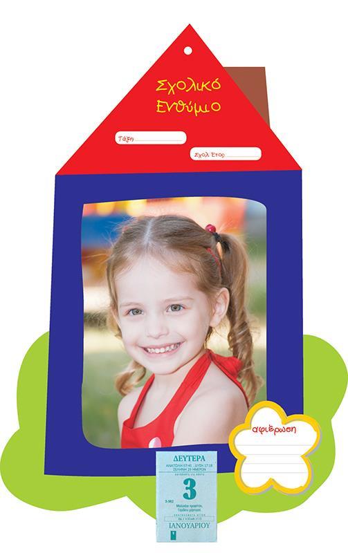 Σχολικό ενθύμιο με κοπτικό “Σπιτάκι” – ημερολόγιο. Η φωτογραφία κολλιέται στην πίσω μεριά του ενθυμίου, με χώρο για χειρόγραφη αφιέρωση του παιδιού. Ο ημερήσιος ημεροδείκτης μπορεί να είναι θρησκευτικός ή ποιημάτων. Διαστάσεις: 22×32εκ. Για φωτογραφία 13×18εκ.