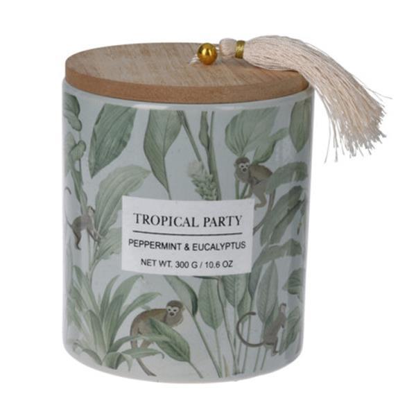 Αρωματικό κερί “Tropical Party” σε κεραμικό βαζάκι με ξύλινο καπάκι και φούντα.