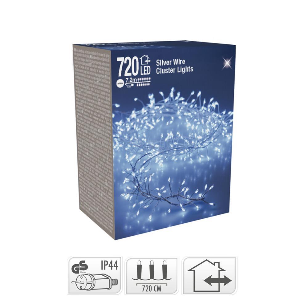 Το προϊόν είναι LED λαμπάκια τύπου silver wire με μικροσκοπικά λευκά φώτα (720 microLED) σε μορφή cluster. Διαθέτουν διάμετρο καλωδίου 0,3mm² με επικάλυψη PP και συνολικό μήκος 7,2 μέτρων, ενώ το καλώδιο σύνδεσης (lead wire) είναι μήκους 5 μέτρων. Το προϊόν συνοδεύεται από προσαρμογέα IP44, κατάλληλο για εξωτερική χρήση. Διαστάσεις συσκευασίας: 13×8,5×17εκ.