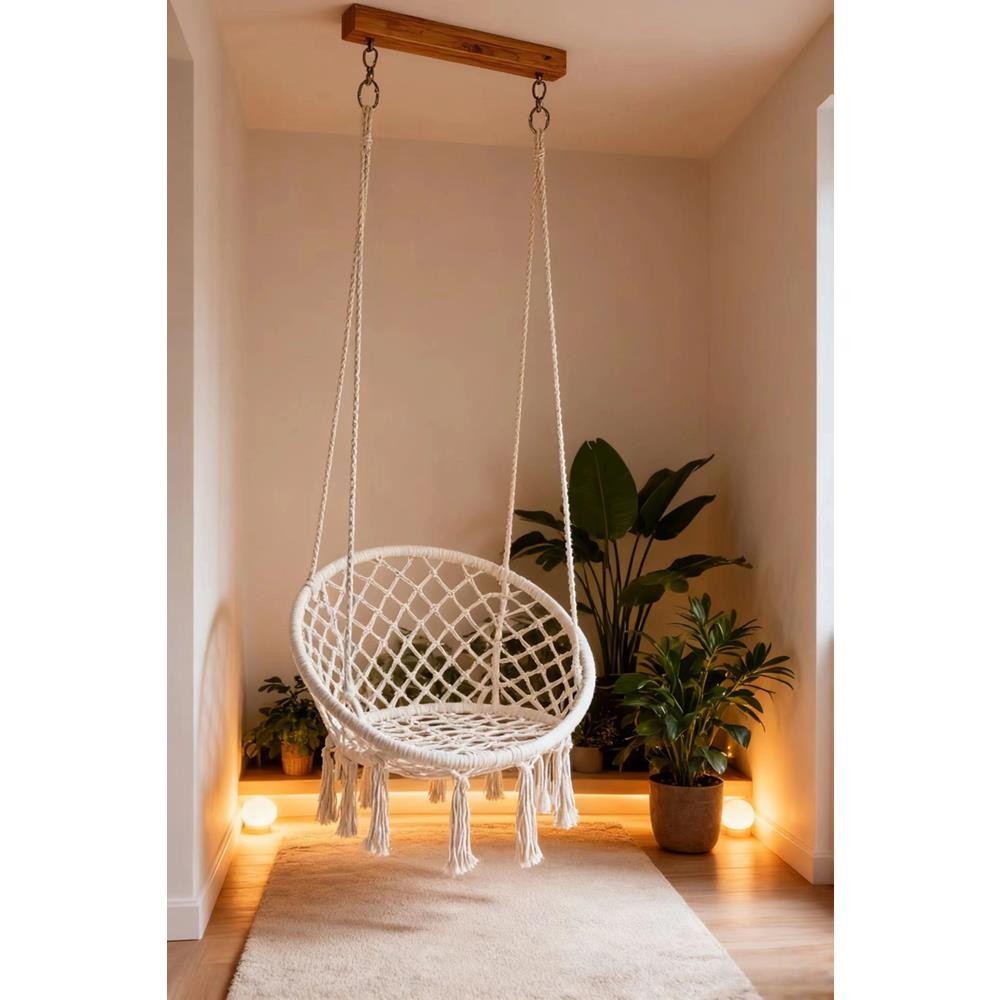 Δημιούργησε μια γωνιά χαλάρωσης με την αιώρα κρεμαστή στρογγυλή Nextdeco. Κατασκευασμένη από ανθεκτικό σχοινί (65% βαμβάκι, 35% πολυεστέρας, πάχους 3mm) με ισχυρό μεταλλικό δακτύλιο, προσφέρει αντοχή έως και 200kg. Ο πλεγμένος σχεδιασμός της με διακοσμητικές φούντες προσθέτει boho αισθητική, καθιστώντας την ιδανική επιλογή για κήπο, βεράντα αλλά και εσωτερικούς χώρους.