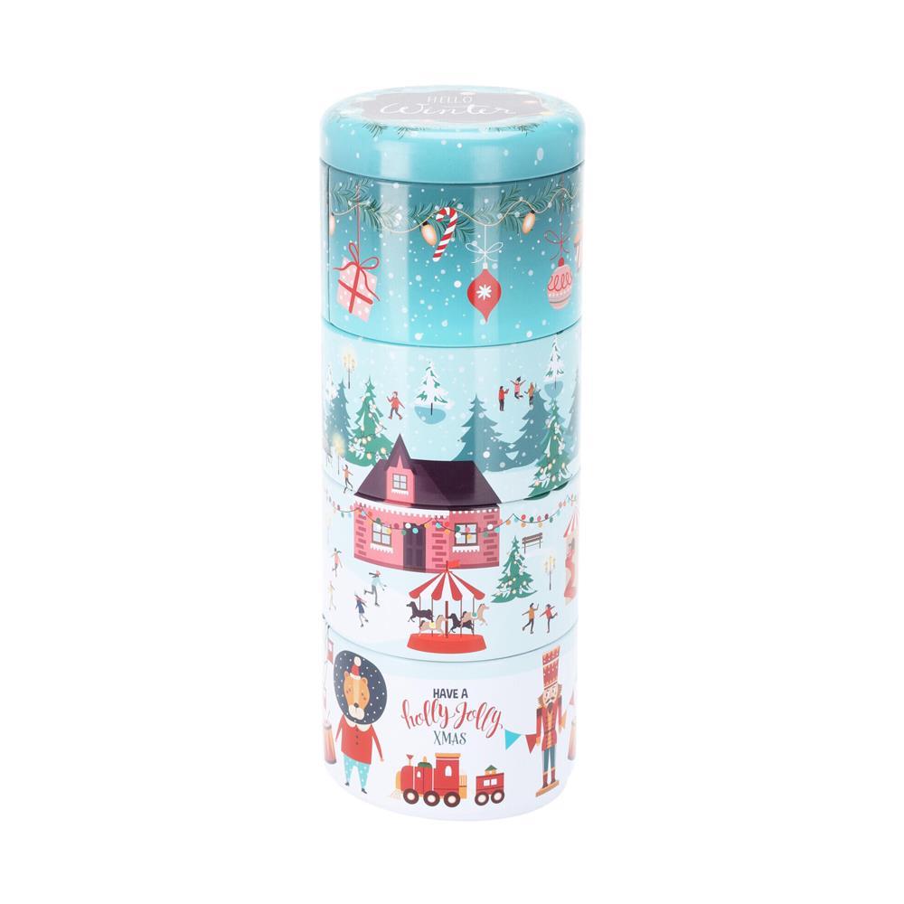 Το χριστουγεννιάτικο σετ 4 τεμαχίων περιλαμβάνει σκεύη αποθήκευσης που στοιβάζονται το ένα πάνω στο άλλο, δημιουργώντας μια γιορτινή παράσταση όταν συνδυάζονται. Τα σκεύη έχουν εορταστικά σχέδια, και κάθε κομμάτι του σετ προσθέτει στο συνολικό θέμα, σχηματίζοντας μια χριστουγεννιάτικη εικόνα. Αυτή η ιδιαιτερότητα το καθιστά όχι μόνο πρακτικό για αποθήκευση, αλλά και διακοσμητικό στοιχείο για την περίοδο των γιορτών. Διάσταση σκεύους ∅8,5xΥ5,5εκ.
