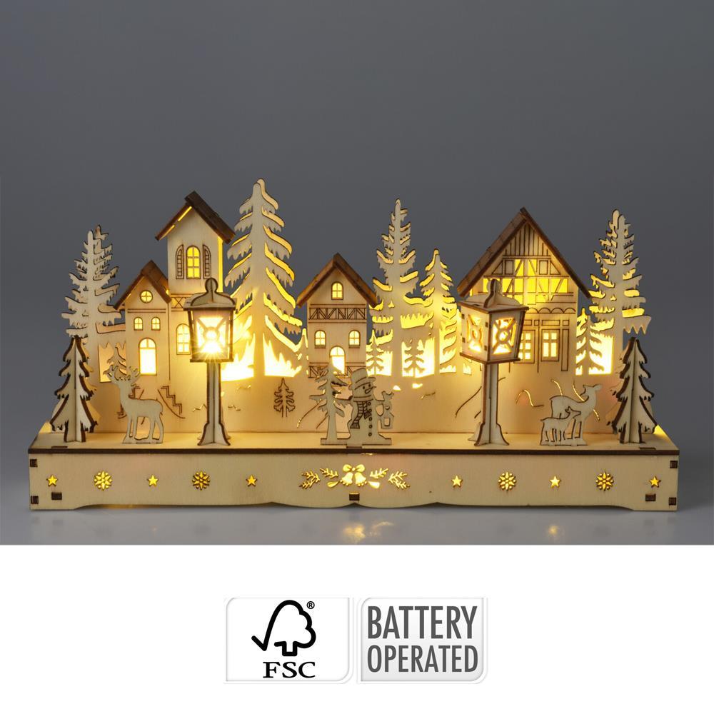 Το διακοσμητικό φωτιζόμενο συγκρότημα σπιτιών από ξύλο λεύκας συνδυάζει 4 ξύλινα σπίτια με καφέ σκεπή, 4 δέντρα και 7 φυσικές φιγούρες σε φυσικό χρώμα, σε μια βάση ύψους 2,8 εκ. και διαστάσεων 29,7×5,8×14,5 εκ. Το συγκρότημα διαθέτει 10 ζεστά λευκά LED, λειτουργεί με 2 μπαταρίες AA (δεν περιλαμβάνονται) και διατίθεται σεσυσκευασία δώρου, κατάλληλη για δώρο εορτών.