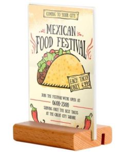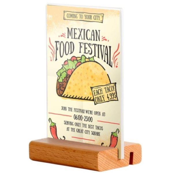 Επιτραπέζια ξύλινη βάση για μενού ή επιγραφές, δύο θέσεων, σε γωνία 90° ή 75°. Με ακρυλική θήκη δύο όψεων 14×21εκ. Κατάλληλη για εσωτερικούς και εξωτερικούς χώρους όπως καταστήματα, εστιατόρια, καφέ και μπαρ. Πλάτος: 6εκ.