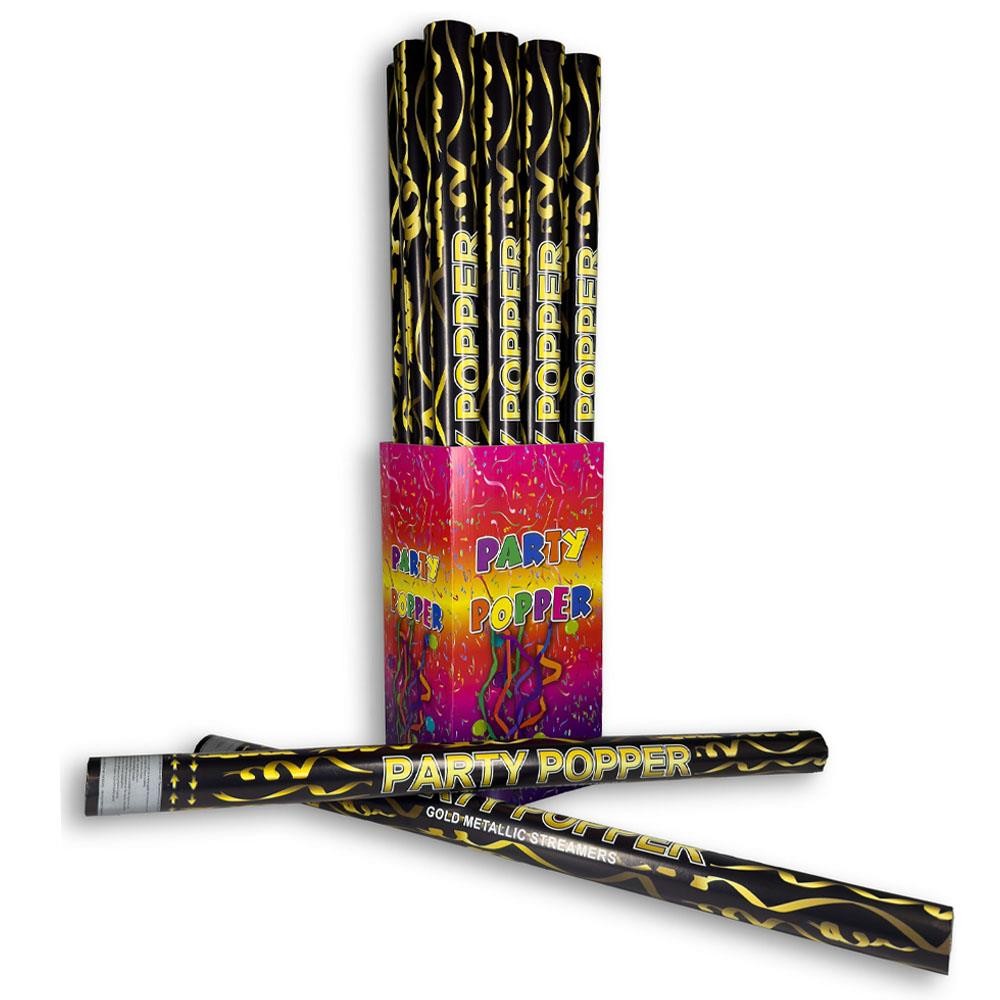 Φαντασμαγορικός κύλινδρος μεταλλιζέ. Δώστε μια έκρηξη χαράς και λάμψης σε κάθε σας εκδήλωση! Αυτά τα κλασικά κανονάκια κομφετί (party poppers) είναι το απόλυτο αξεσουάρ για να απογειώσετε τη διάθεση των καλεσμένων σας.