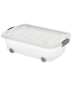 Κουτί αποθήκευσης με ασημί χερούλια και ρόδες.