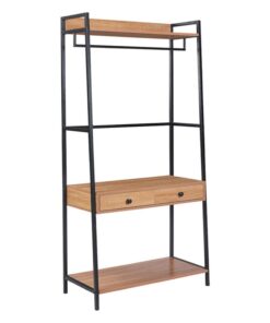 Κρεμάστρα οργάνωσης ρούχων Nextdeco. Ο σκελετός από μέταλλο με ηλεκτροστατική βαφή σε μαύρο ματ χρώμα προσφέρει σταθερότητα, ενώ τα ράφια είναι από MDF 15mm με επένδυση μελαμίνης που δίνει φυσική ξύλινη όψη και ανθεκτικότητα. Ιδανική για σαλόνι, κουζίνα, χωλ ή γραφείο, αποτελεί λύση αποθήκευσης με κομψό industrial χαρακτήρα.