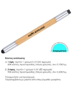 Μολύβι – στυλό (4 σε 1) Υ14,8xØ1,1εκ μπαμπού. Ένα πολυλειτουργικό εργαλείο γραφής από bamboo που συνδυάζει στυλό διαρκείας με μπλε μελάνι, εργαλείο για οθόνες αφής, μολύβι και γόμα για διόρθωση. Ο μοντέρνος και φιλικός προς το περιβάλλον σχεδιασμός, καθιστούν αυτό το οργανο γραφής μοναδικό για κάθε χρήση. Διαστάσεις: Υ14,8xØ1,1εκ. Δυνατότητα προσωποποίησης για διαφημιστικό.