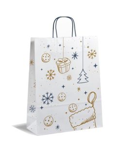 Χάρτινη τσάντα λευκή με χριστουγενιάτικο μοτίβο και μπλε στριφτό χερούλι.