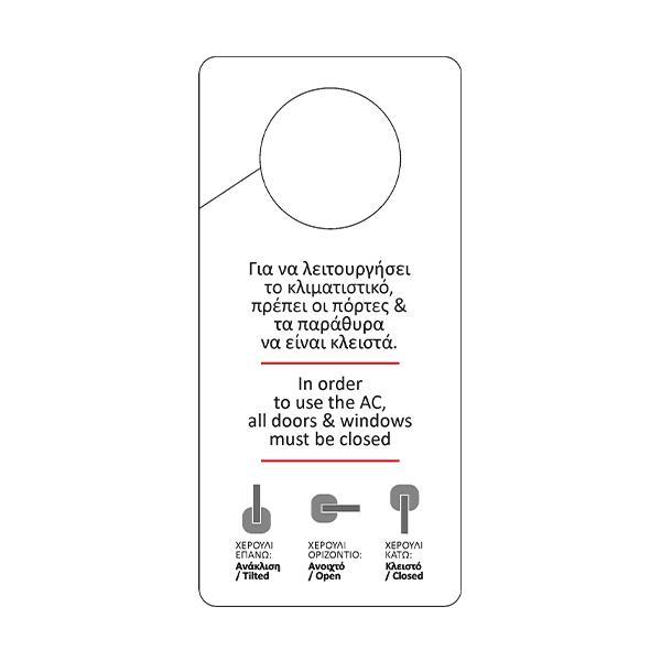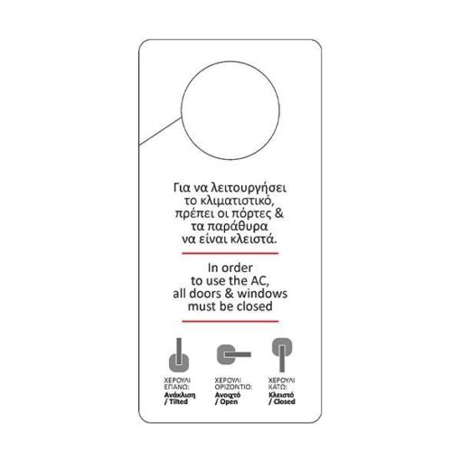 Next κρεμαστή επιγραφή για το πόμολο της μπαλκονόπορτας ή του παραθύρου “Για να λειτουργήσει το κλιματιστικό, πρέπει οι πόρτες και τα παράθυρα να είναι κλειστά”.