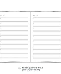 Περιέχει 2 σελίδες συνοπτικό πλάνο 2026-2031, 13 σελίδες μηνιαίο πλάνο και 176 σελίδες εβδομαδιαίο πλάνο (χωρίς ημερομηνίες, δεξιά πλευρά σημειώσεις). Ατομική συσκευασία με θερμοσυρίκνωση, δυνατότητα εκτύπωσης logo ή ονόματος και δυνατότητα πλήρους προσωποποίησης (logo στη ρίγωση, χαρτί σαμουά, ένθετα κ.α).