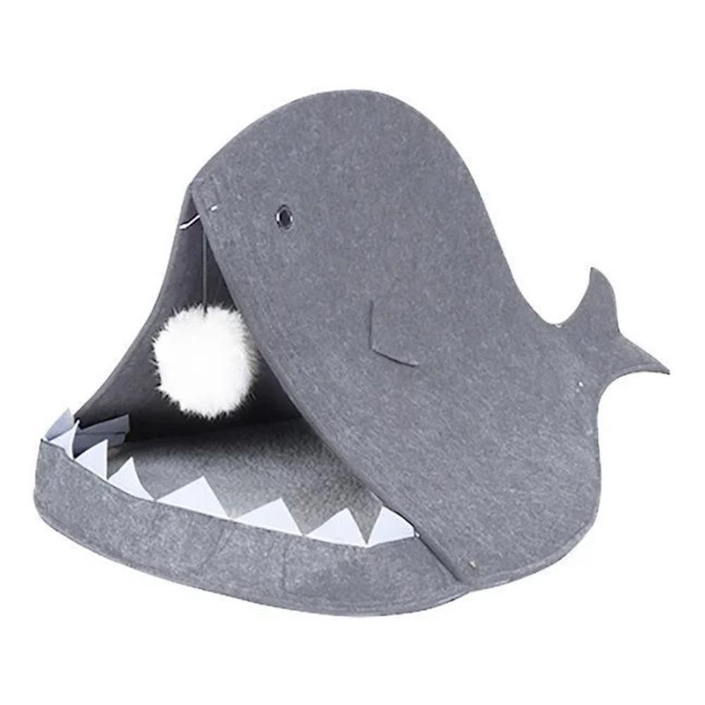 Υπέροχο πτυσσόμενο σπιτάκι για τα αγαπημένα μας γατάκια απο τσόχα, με εσωτερική μαλακή επένδυση, σε σχήμα ψαριού και με ενσωματωμένο κρεμαστο παιχνίδι για το μικρό σας τετράδοπο.
