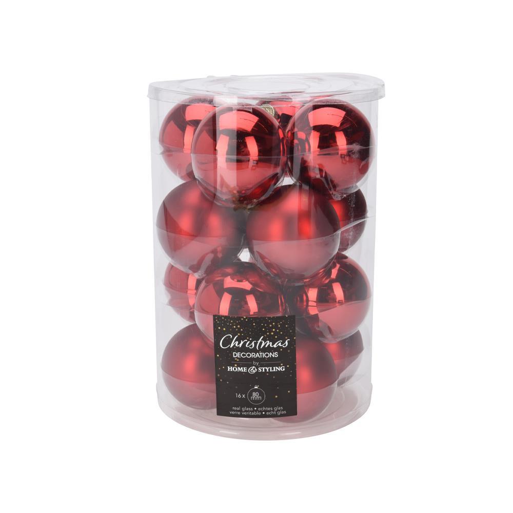 Σετ 16 χριστουγεννιάτικων γυάλινων μπαλών Ø8εκ. σε κόκκινο χρώμα, με 8 ματ και 8 γυαλιστερές. Η κομψή διπλή υφή τους χαρίζει εντυπωσιακό αποτέλεσμα και πολυτέλεια στον στολισμό του δέντρου. Ιδανικές για μεγαλύτερα δέντρα ή για όσους θέλουν ένα πιο έντονο διακοσμητικό στοιχείο στις γιορτές.