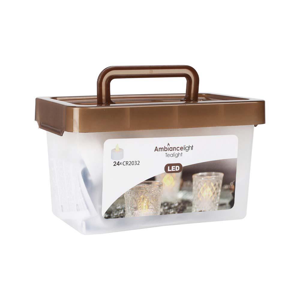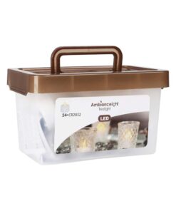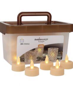 Σετ 24 LED ρεσώ με εφέ τρεμοπαίγματος σε θερμό λευκό φως, ιδανικά για ατμοσφαιρικό και ασφαλές φωτισμό χωρίς ανοιχτή φλόγα. Κάθε ρεσώ διαθέτει ενσωματωμένη μπαταρία CR2032 (περιλαμβάνεται) με διάρκεια λειτουργίας 60–96 ώρες και εύχρηστο σύστημα ενεργοποίησης με διπλό κλικ. Συσκευασμένα σε πρακτικό κουβά με καπάκι που κλείνει, για εύκολη αποθήκευση και μεταφορά.