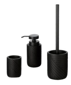 Η σειρά Nairobi Black συνδυάζει πρακτικότητα και μοντέρνα αισθητική, φέρνοντας κομψότητα σε κάθε μπάνιο. Το σετ περιλαμβάνει dispenser σαπουνιού, θήκη οδοντόβουρτσας και πιγκάλ, όλα με ανθεκτική κατασκευή και ανάγλυφο σχέδιο σε μαύρη ματ απόχρωση.