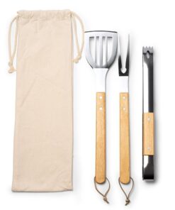 Πρακτικό σετ μπάρμπεκιου 3 τεμαχίων με εξαρτήματα από ανοξείδωτο ατσάλι και ξύλινες λαβές: πιρούνα, λαβίδα και σπάτουλα. Το σετ περιλαμβάνει βαμβακερό κάλυμμα με κορδόνι για εύκολη αποθήκευση και μεταφορά. Ιδανικό για ψήσιμο στον κήπο, στο camping ή σε εξωτερικές εκδηλώσεις. Ανθεκτική κατασκευή, εργονομικές λαβές και διαχρονικό design. Διαστάσεις: 14x49x5εκ.