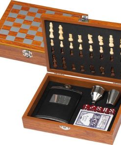 Περιλαμβάνει πούλια και ταμπλώ για σκάκι, τράπουλα, 5 ζάρια και φλασκί 237 ml με δύο σφηνοπότηρα.