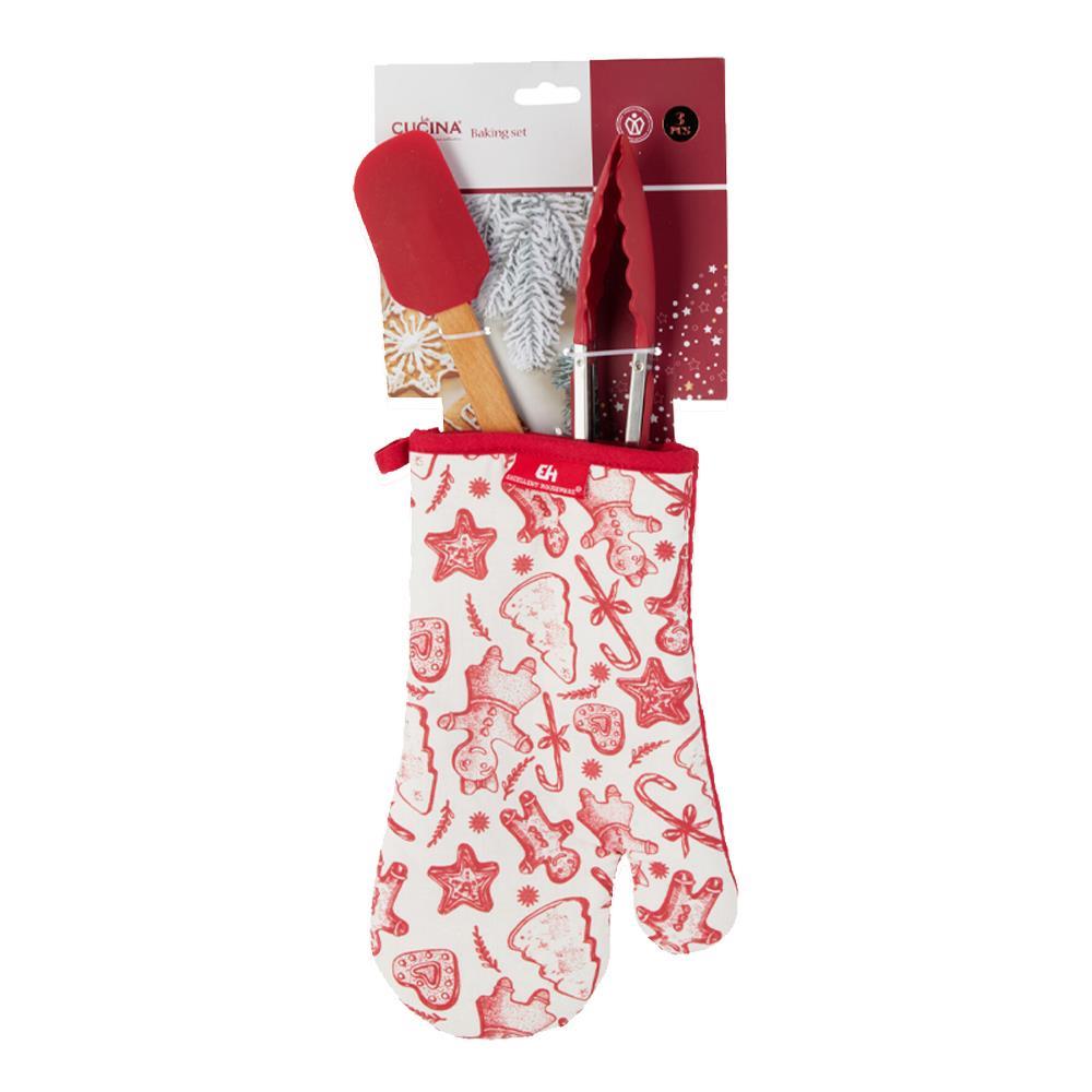 Σετ κουζινικής χρήσης 3 τεμαχίων με χριστουγεννιάτικο σχέδιο, ιδανικό για τις γιορτινές δημιουργίες σας. Περιλαμβάνει βαμβακερό γάντι κουζίνας, σπάτουλα σιλικόνης με ξύλινη λαβή και μεταλλική λαβίδα με αντιολισθητική λαβή. Ένα πρακτικό και εορταστικό σετ που προσφέρει ασφάλεια και ευκολία στο ψήσιμο και το μαγείρεμα.