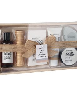 Το σετ περιλαμβάνει αφρόλουτρο 100ml, ξύλινο μασάζ, κρύσταλλο μπάνιου 50 γραμμάρια, λοσιόν σώματος 75 ml, αφρός μπάνιου, απολέπιση σώματος 50 γραμμάρια.