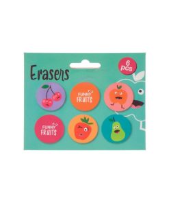 Οι σβήστρες “Funny Fruit” είναι ένα σετ 6 τεμαχίων που έρχονται σε συσκευασία blister. Οι σβήστρες έχουν διάφορα σχέδια εμπνευσμένα από φρούτα και είναι αισθητικά ευχάριστες, κάνοντας τη διαδικασία του σβησίματος πιο ευχάριστη. Οι διαστάσεις της συσκευασίας είναι 13×11.5×0,5 εκ. και οι σβήστρες έχουν διάμετρο Ø3×0,5 εκ.