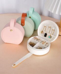 Μικρή και πρακτική στρόγγυλη γαλάζια θήκη κοσμημάτων με μοντέρνο λουράκι κουμπώματος. Ιδανική για ταξίδια, δώρα ή καθημερινή αποθήκευση κοσμημάτων στο σπίτι.