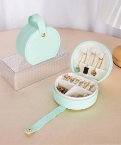 Μικρή και πρακτική στρόγγυλη γαλάζια θήκη κοσμημάτων με μοντέρνο λουράκι κουμπώματος. Ιδανική για ταξίδια, δώρα ή καθημερινή αποθήκευση κοσμημάτων στο σπίτι.