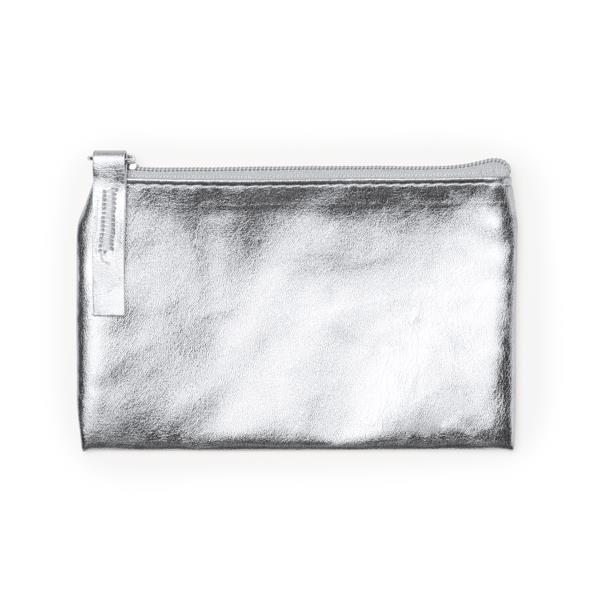 Τσαντάκι PU γυαλιστερό ασημί με ασορτί φερμουάρ και λαβή. Κατάλληλο για κέρματα ή μικροπράγματα. Διαστάσεις: 12×0,5×8,5εκ.