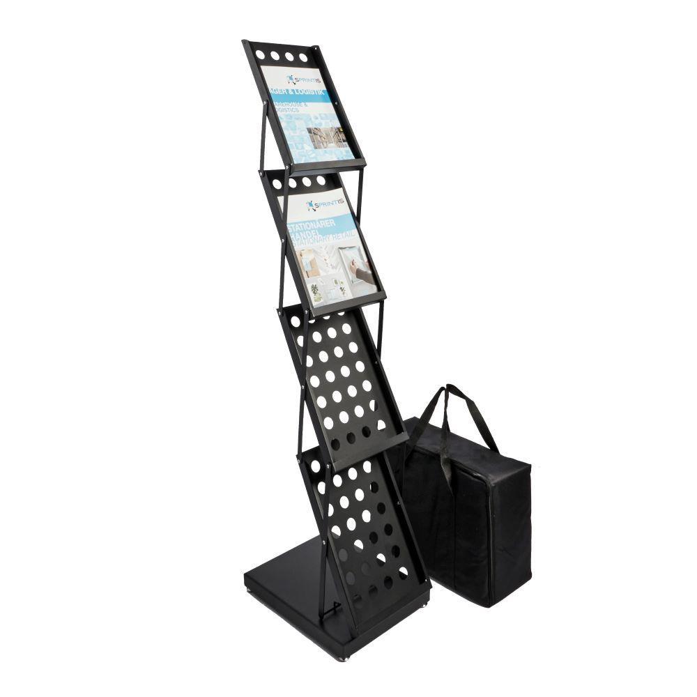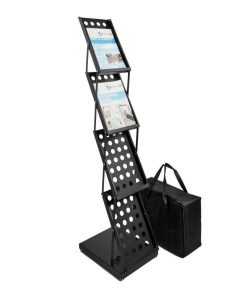 Η πτυσσόμενη μεταλλική βάση εντύπων είναι κατασκευασμένη από ανθεκτικό μέταλλο με μαύρη επίστρωση, διαθέτει 4 θέσεις για καταλόγους και φυλλάδια σε μέγεθος Α4, και έχει διαστάσεις Υ132x27x36 εκ. Συνοδεύεται από μαύρη τσάντα μεταφοράς για εύκολη αποθήκευση και μετακίνηση. Διαστάσεις συσκευασίας: 30x35x19εκ.