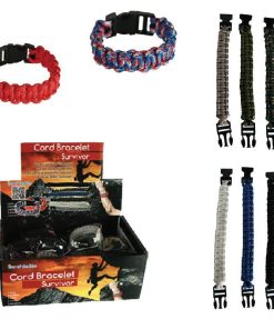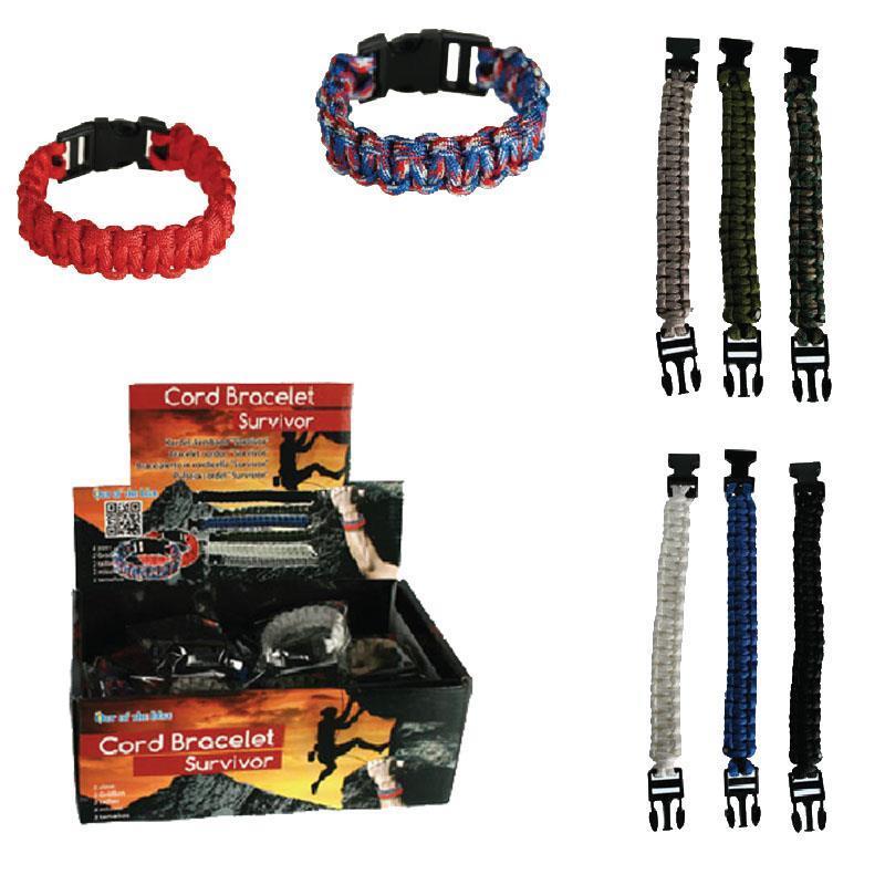 Βραχιόλι επιβίωσης σε 8 χρωματισμούς και 2 μεγέθη που ανοίγει και κλείνει με πλαστικό κλιπ.